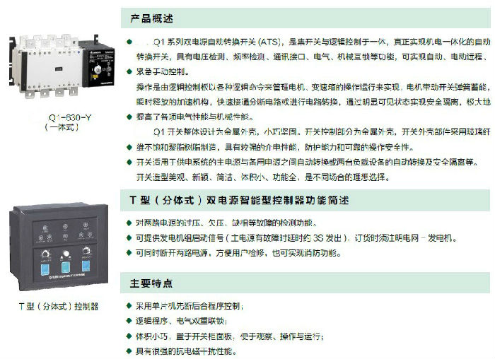 NYQ1 系列双电源自动转换开关主要用于交流50Hz,额定工作电压AC400V 直流额定工作电压220V,额定工作电流16A 至3200A 的配电或电动机网络中一主一备或互为备用电源切换系统及市电和发电机组的负荷切换。同时可用于不频繁接通与分断电路及线路的隔离之用,但不起过载保护和短路保护作用。