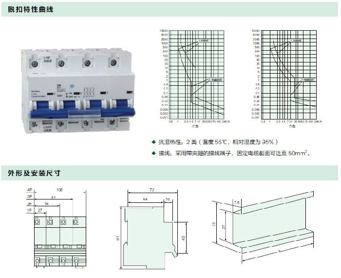该产品外形美观、体积小、重量轻、电流脱扣整定精确、动作可靠、分断能力高、脱扣迅速、导轨安装、组合模式设计可与辅助触头、报警指示触头、欠压脱扣器、分励脱扣器等附件组合,满足不同用户的需求,壳体和部件采用高阻燃及耐冲击塑料,使用寿命长。