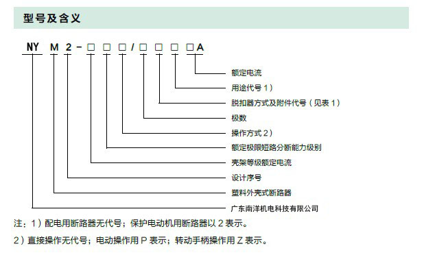 NYM2 系列塑料外壳式断路器(以下简称断路器),是本公司采用国际先进的设计和制造技术进行研制和开发的新型断路器之一。其额定绝缘电压为800V,适用于交流50Hz,额定工作电压AC690V及以下,额定工作电流至800A 的电路中作不频繁转换及电动机不频繁启动之用。断路器具有过载、短路和欠电压保护装置,能保护线路和电源设备免受损坏。