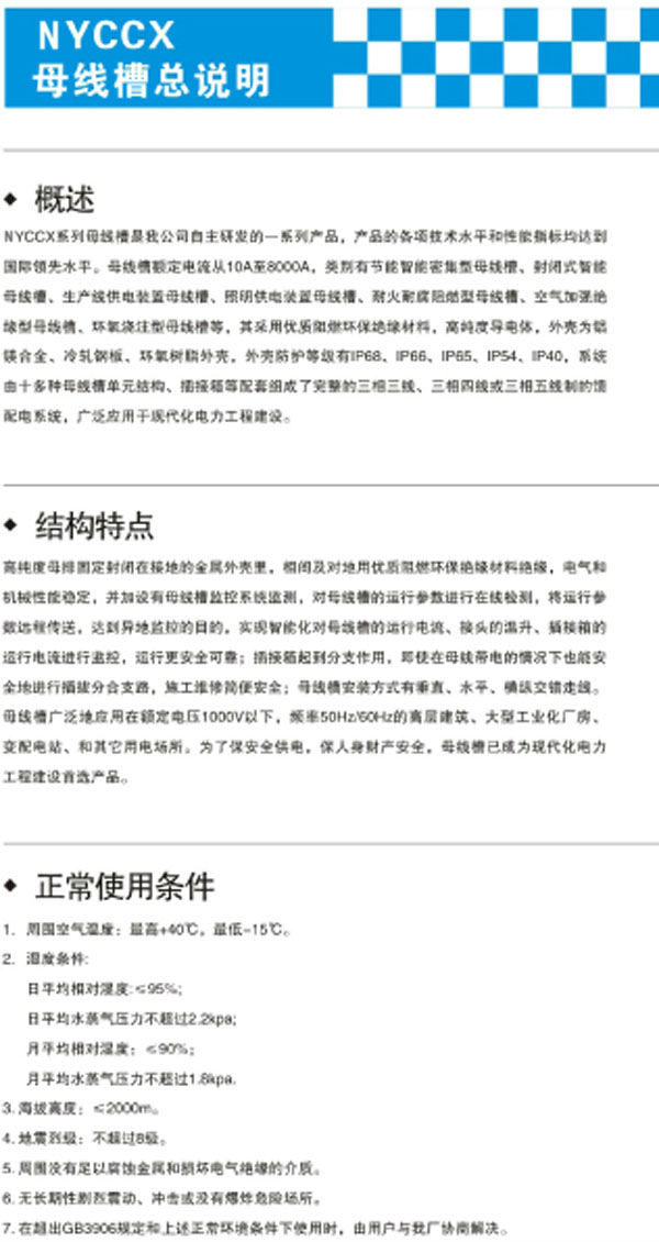 NYCCX系列母线槽是一款智能型环保、节能母线槽;该系列母线槽采用三明治结构,相与相、相与外壳均紧贴在一起,短路耐受强度,可完全达到,甚至超过国家强制要求,也解决了烟囱效应的问题。该系列母线槽导体选用优质电力铜母线(铜排),增加了锁扣式的装配功能,经过新工艺的处理,绝缘强度高、涡流小、阻抗低、能耗小。性价比出众,适用广泛。